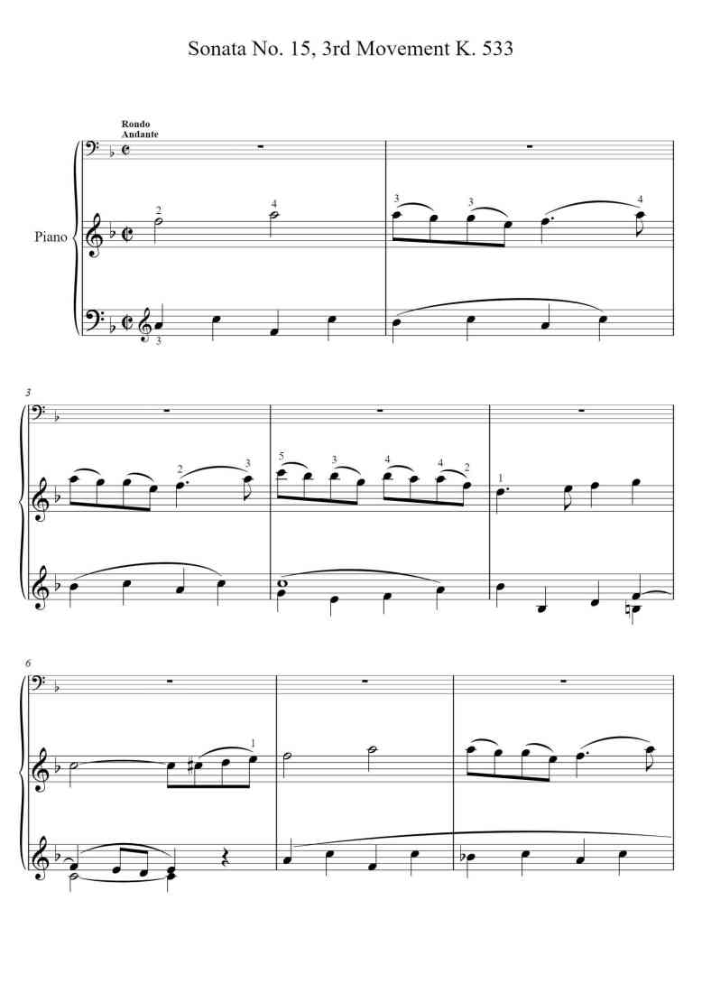 - IntroductionPiano Sonata No. 15 in F Major, K.533, 3rd Movement (Rondo: Allegretto), Sheet Music is F Major, Composer by Wolfgang Amadeus Mozart and Arr.Wolfgang Amadeus Mozart,Suitable for all Users to play learning.