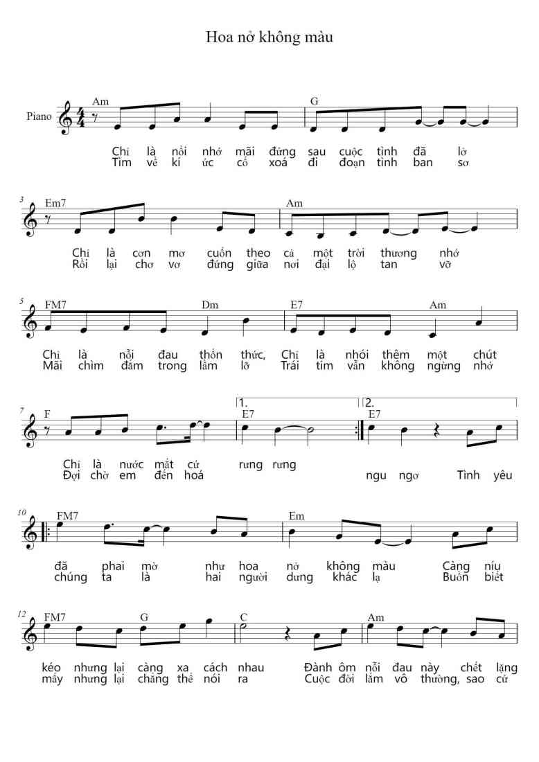 - IntroductionHoa nở không màu, Sheet Music is F Major, Composer by Nguyễn Minh Cường Arranged by Thiện Nhân and Arr.Nguyễn Minh Cường,Suitable for all Users to play learning.