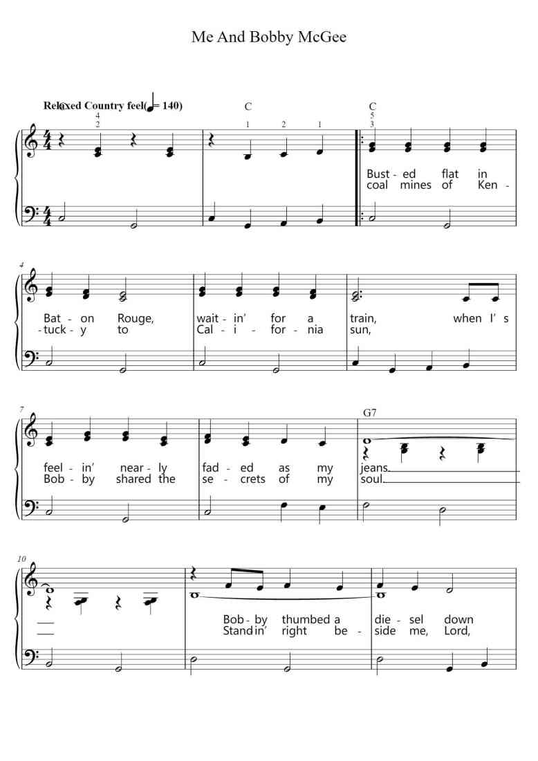 - IntroductionMe and Bobby McGee, Sheet Music is C Major, Composer by Fred Foster, Kris Kristofferson and Arr.Janis Joplin,Suitable for all Users to play learning.