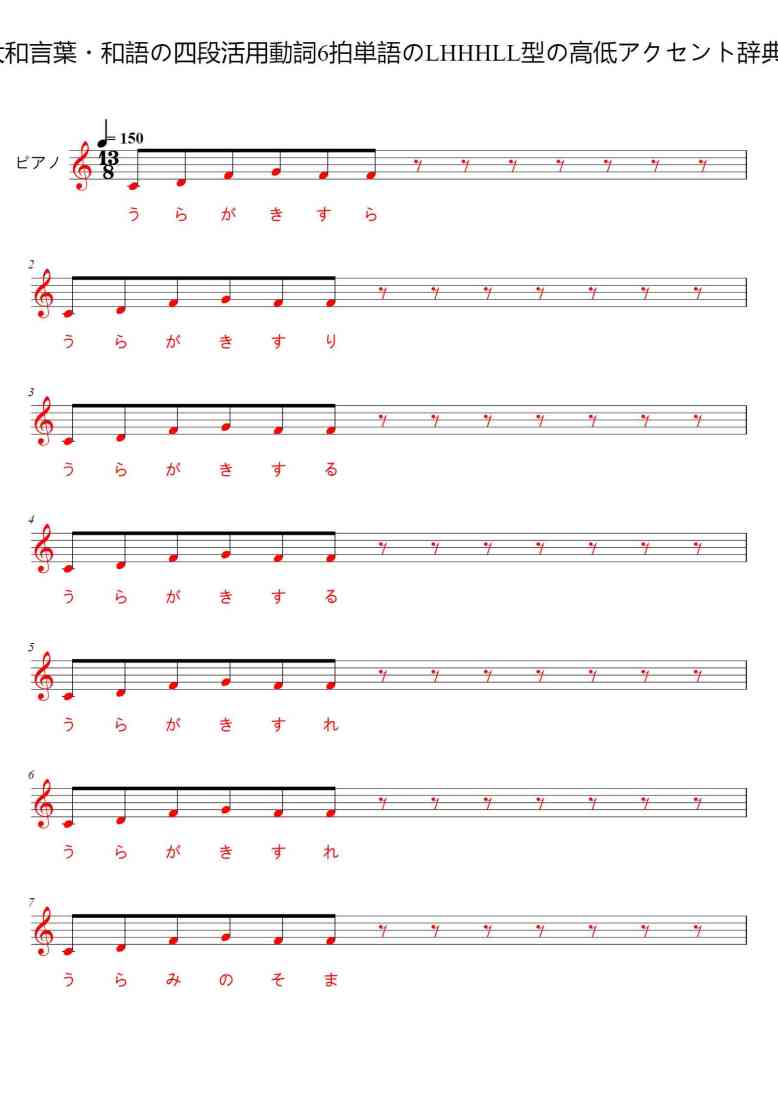 Piano Song Names: 大和言葉・和語の四段活用動詞6拍単語のLHHHHH型の高低アクセント辞典4